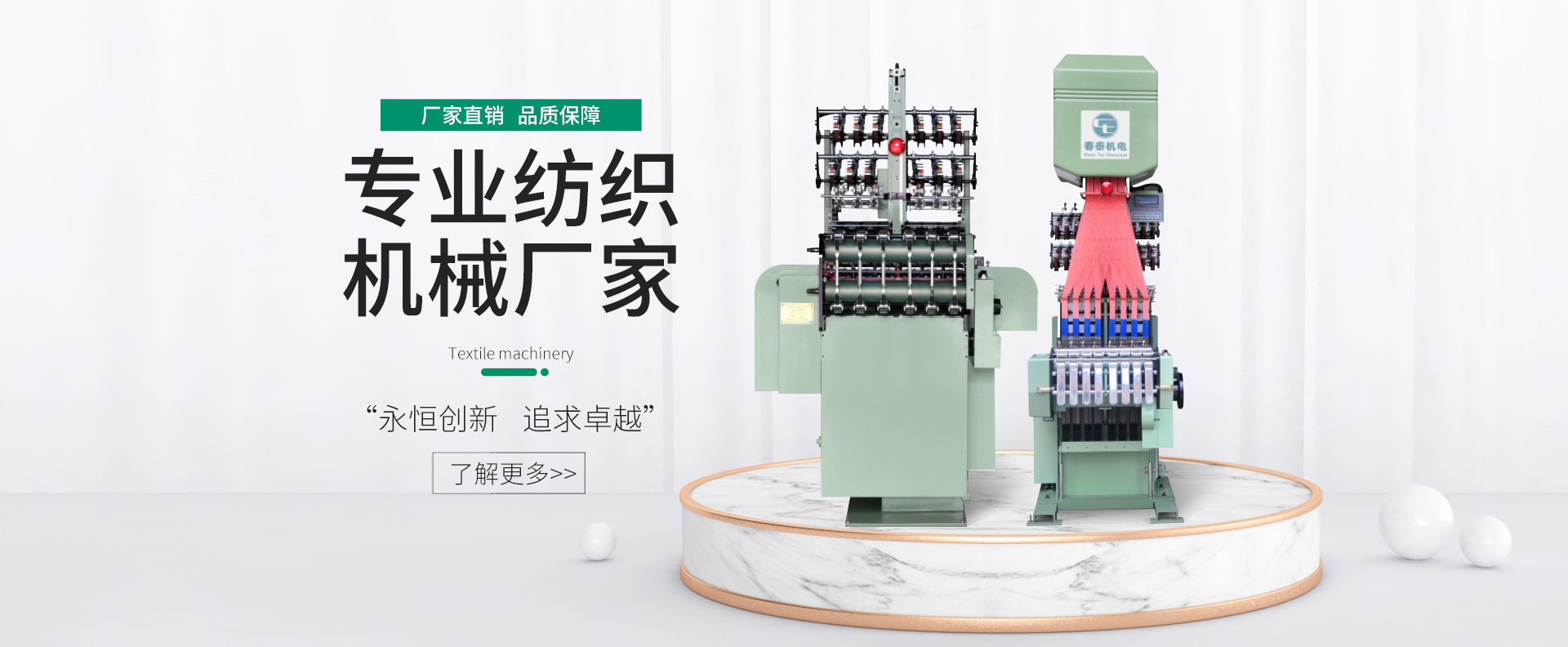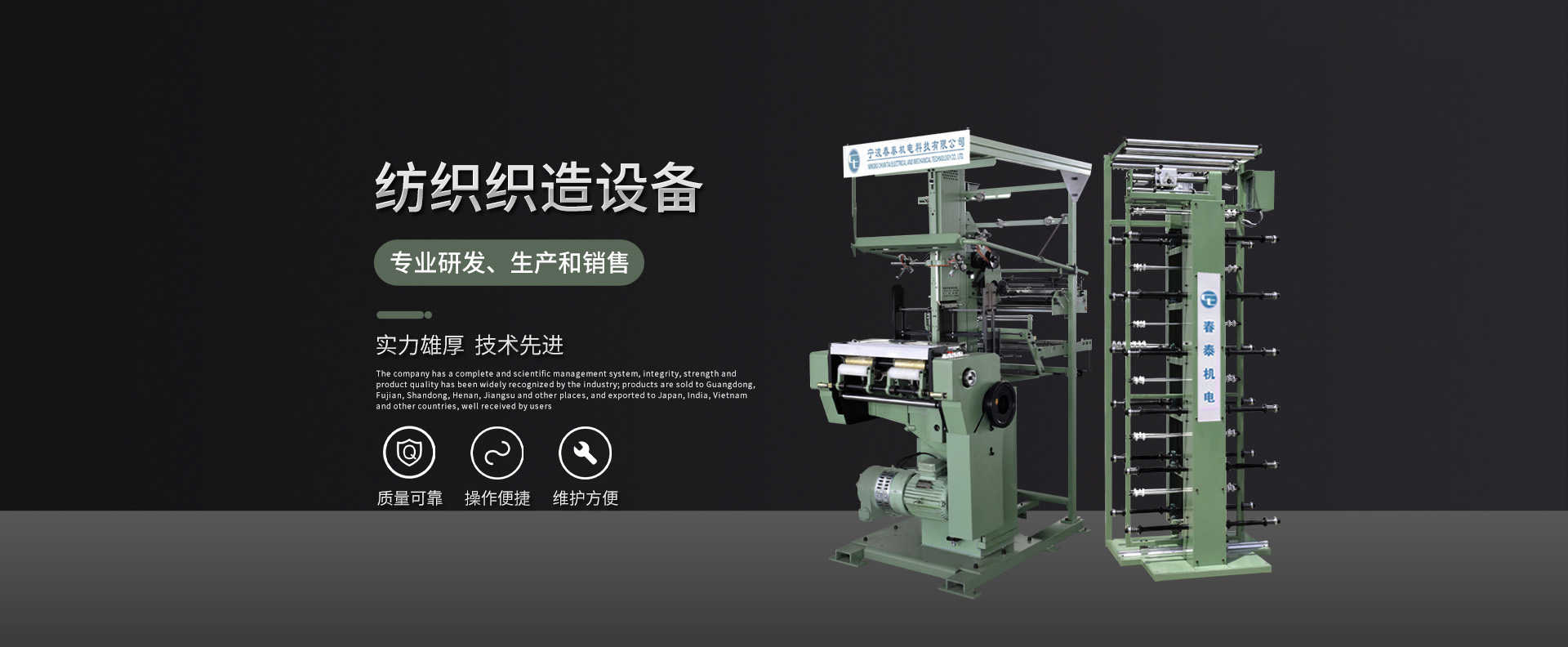 寧波春泰機(jī)電科技有限公司是一家專業(yè)從事紡織織造設(shè)備的研發(fā)、生產(chǎn)和銷售的科技型企業(yè);目前公司在制產(chǎn)品有射出勾機(jī)生產(chǎn)線、高速無(wú)梭尼龍粘扣帶機(jī)、電腦提花織帶機(jī)、高速無(wú)梭織帶機(jī)、自動(dòng)卷帶機(jī)等;公司技術(shù)力量雄厚,核心技術(shù)已進(jìn)行知識(shí)產(chǎn)權(quán)保護(hù);地處美麗的海濱城市——寧波,緊靠杭州灣跨海大橋和寧波繞城高速,交通便利;公司擁有完整、科學(xué)的管理體系,誠(chéng)信、實(shí)力和產(chǎn)品質(zhì)量獲得業(yè)界的廣泛認(rèn)可;產(chǎn)品銷往廣東、福建、山東、河南、江蘇等地,并出口日本、印度、越南等國(guó)家,深受用戶的好評(píng)。